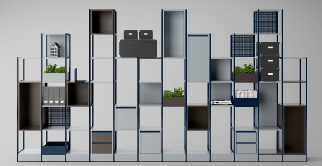 Com a ascensão dos modelos híbridos de trabalho e a busca por ambientes mais colaborativos, os móveis modulados ganham ainda mais relevância. Estantes modulares, mesas operativas com divisórias móveis e bancadas compartilhadas são soluções que promovem interação, conforto e otimização de espaço.